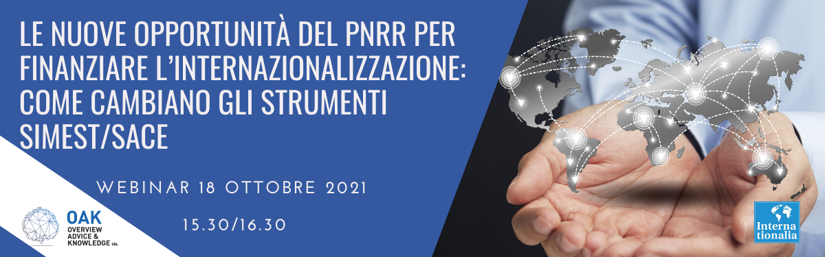Cambiano, anche alla luce del PNRR, gli strumenti che SACE e Simest mettono a disposizione delle aziende italiane per finanziare le operazioni di internazionalizzazione. Per scoprire i nuovi strumenti finanziari a sostegno delle aziende, Oak srl, in collaborazione con Internationalia, organizza lunedì 18 ottobre 2021 alle ore 15.30/16:30 un rapido webinar in cui verranno presentate le nuove modalità di azione di Simest e SACE e in cui due professionisti abilitati ad operare con entrambi i gruppi risponderanno alle domande delle aziende.
