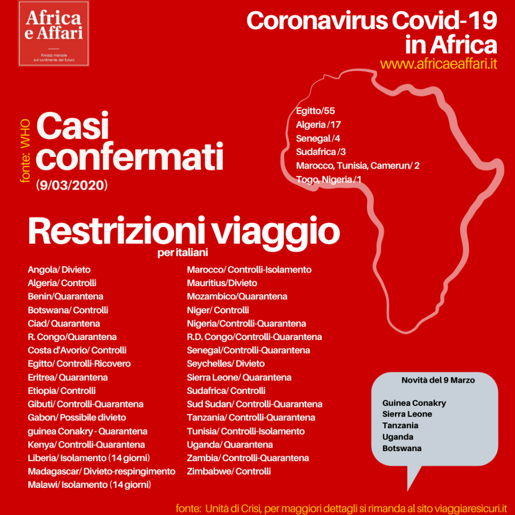 AFRICA – (aggiornamento del 9 Marzo) Salgono i casi confermati di coronavirus in Africa, secondo i dati dell’Organizzazione Mondiale della Sanità (OMS/WHO), dove si sono moltiplicati i contagi in Egitto, mentre i primi casi (rispetto all’ultimo aggiornamento da noi pubblicato) si sono registrati in Togo e Camerun.