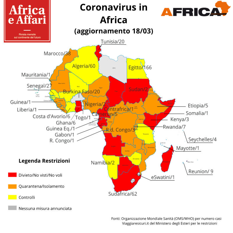AFRICA – (aggiornamento del 18 Marzo) Anche Somalia e Liberia sono ufficialmente entrati nelle ultime 24 ore nella lista dei paesi africani che hanno già registrato almeno un caso positivo al Coronavirus-Covid19.