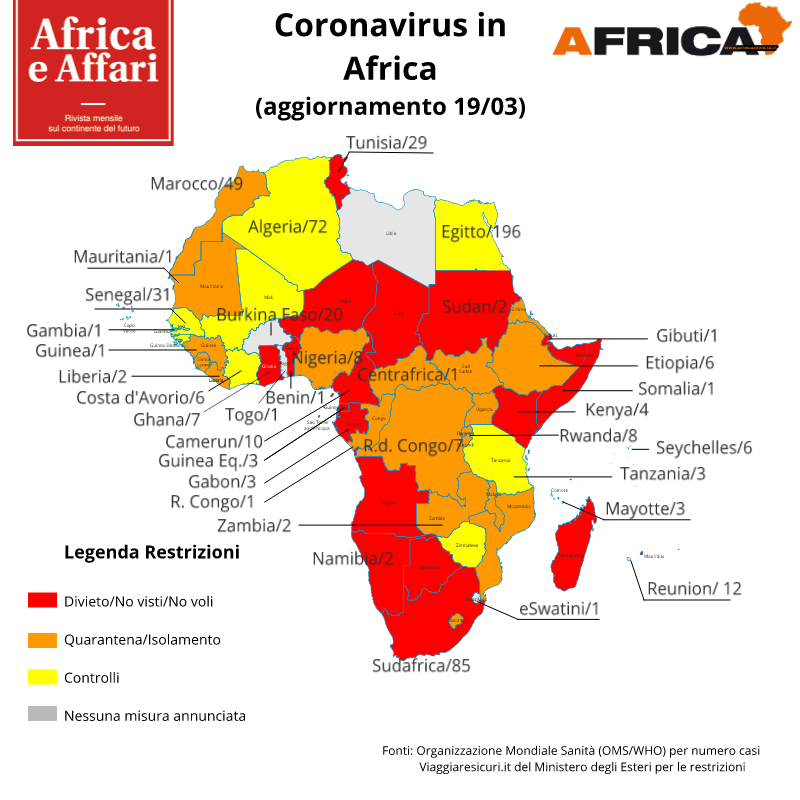 AFRICA – (aggiornamento del 19 Marzo) Gibuti, Zambia, Tanzania e Gambia sono i paesi africani che nelle ultime 24 ore hanno segnalato di aver registrato il loro primo caso positivo al Coronavirus-Covid19.
