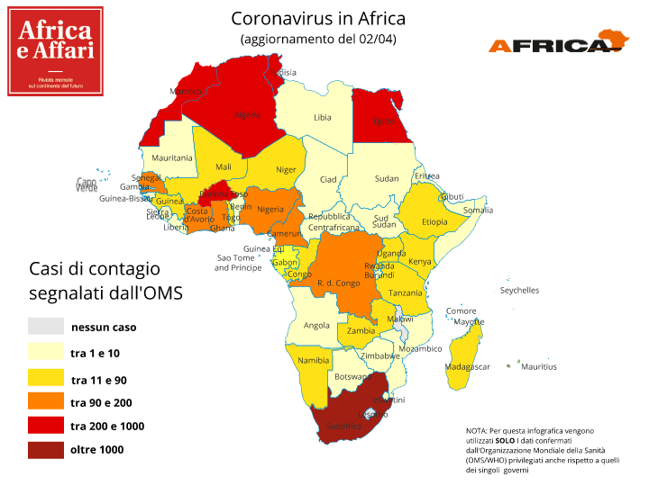 AFRICA – (aggiornamento del 2 Aprile) Resta costante costante, e tutto sommato limitata, la diffusione del  coronavirus Covid-19 in Africa, continente che vede il Sudafrica registrare il focolaio maggiore con un numero di contagi salito a 1326 e che nelle ultime 24 ore vede anche tre paesi, Botswana, Sierra Leone e Burundi, segnalare i primi casi positivi al coronavirus.