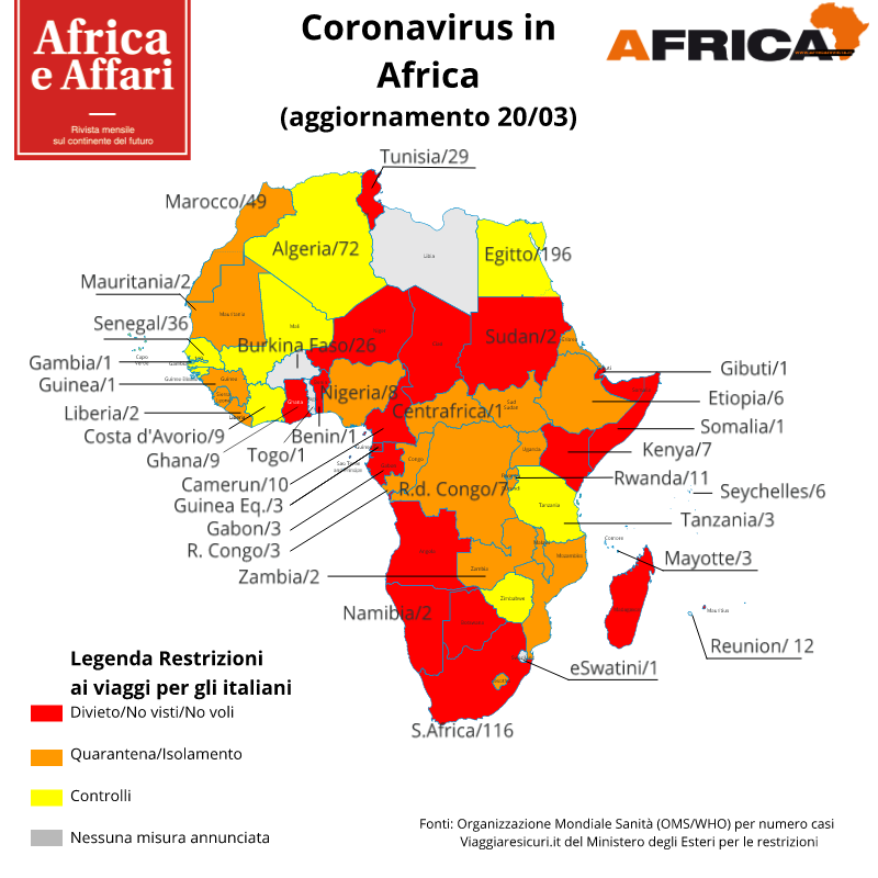 AFRICA – (aggiornamento del 20 Marzo) Prosegue, seppur in modo contenuto, la diffusione del coronavirus nel continente africano.