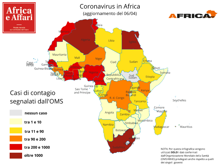 AFRICA – (aggiornamento del 6 Aprile) Resta controllata la diffusione del coronavirus Covid-19 in Africa, secondo gli ultimi dati diffusi dall’Organizzazione Mondiale della Sanità.