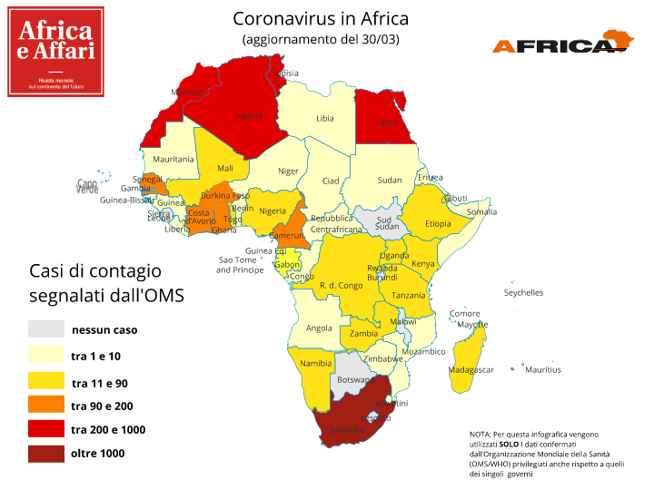 AFRICA – (aggiornamento del 30 Marzo) Continuano ad aumentare, ma in maniera regolare, i dati della diffusione del Covid-19 in Africa, dove spicca la situazione del Sudafrica, unico paese del Continente ad aver superato la soglia dei 1000 casi.