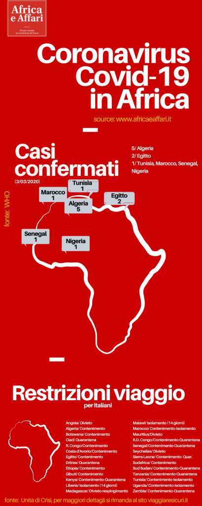 Nella speranza di fornire un servizio utile a monitorare l’evolversi del virus nel Continente e ad aggiornare le misure di prevenzione e contenimento che i governi africani stanno introducendo a partire da oggi aggiorneremo quotidianamente i dati seguenti.