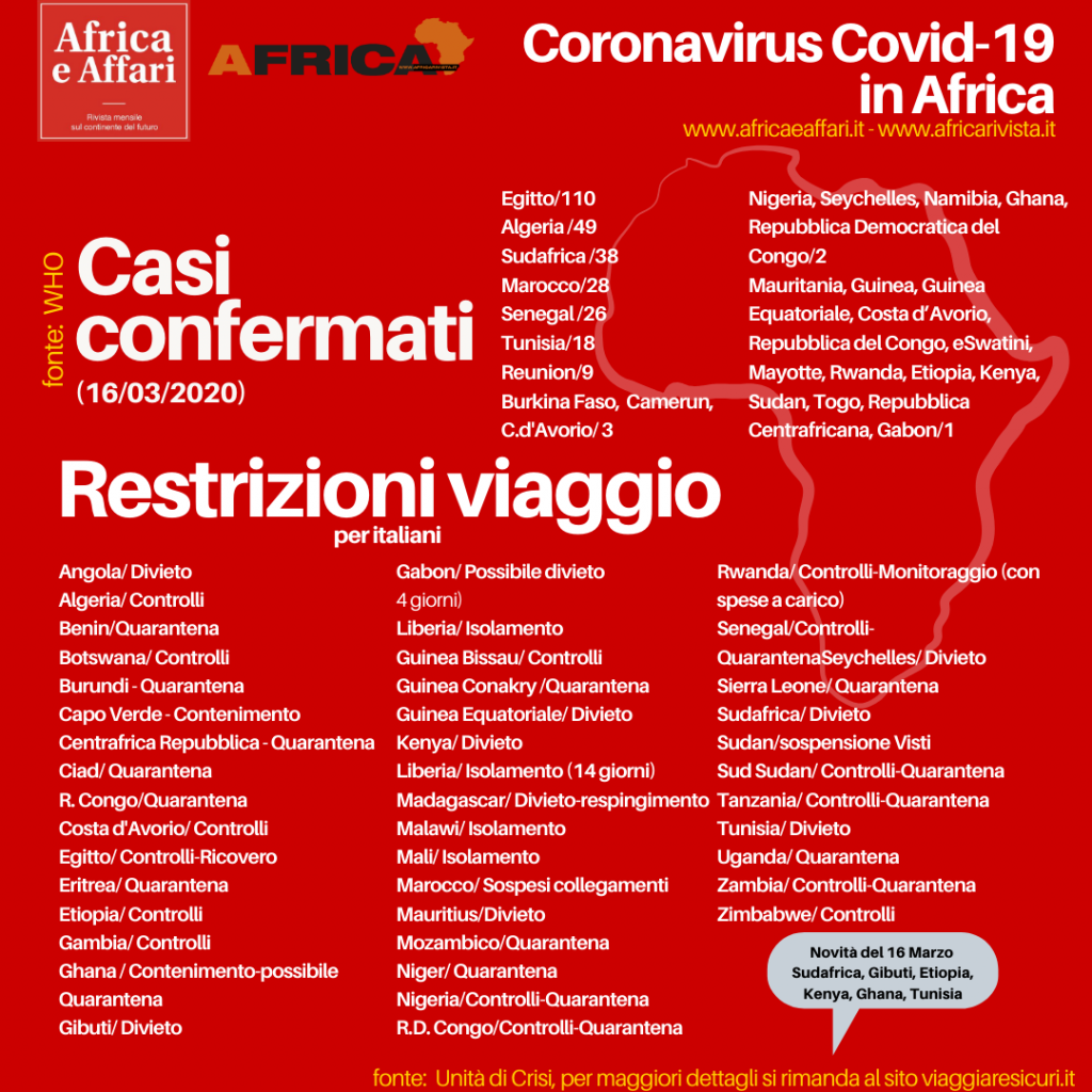 AFRICA – (aggiornamento del 16 Marzo) Sembra essere infine arrivata anche nel continente africano l’epidemia di coronavirus Covid-19 che, secondo gli ultimi dati confermati dall’Organizzazione Mondiale della Sanità (OMS/WHO), vede allungarsi in maniera esponenziale la lista dei paesi che hanno registrato almeno un positivo al virus. Parallelamente sono molti i paesi che hanno irrigidito ulteriormente le misure di restrizione per i viaggiatori che provengono dall’estero, in particolare dall’Italia, ma ormai anche da altri paesi europei, asiatici o anche da altri paesi africani.